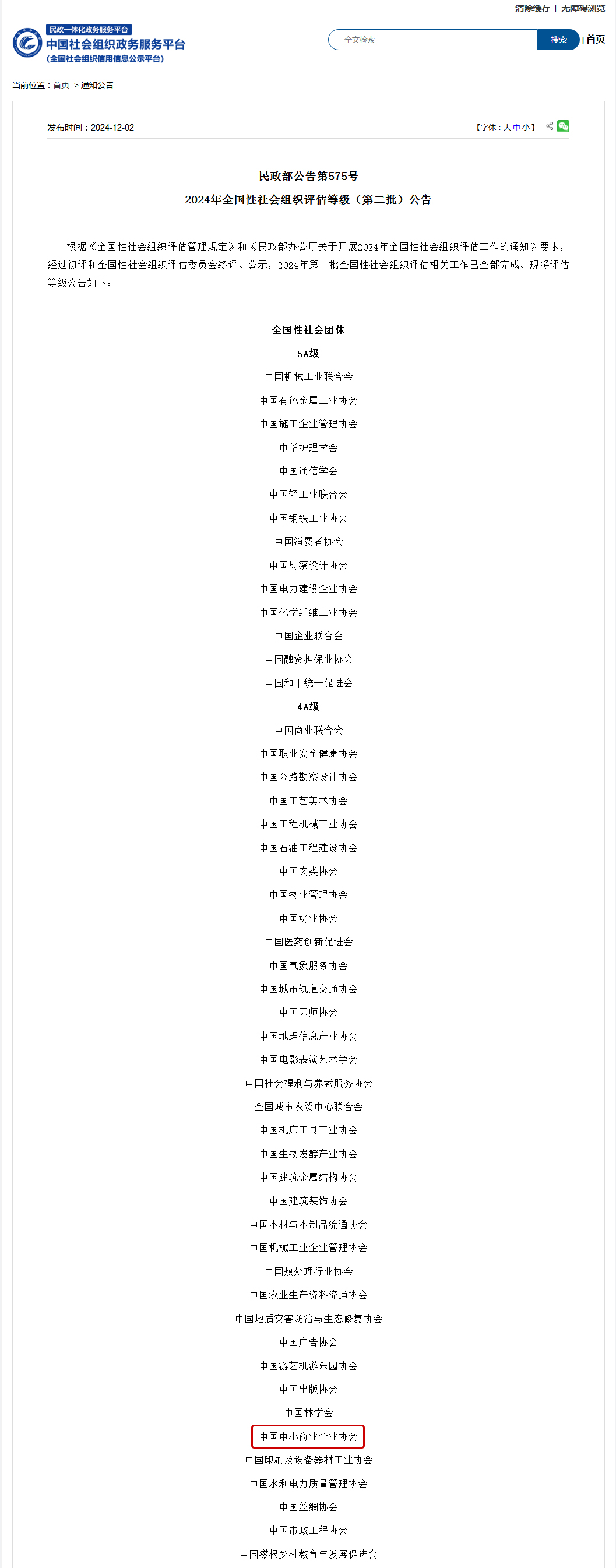 根据《全国性社会组织评估管理规定》和《民政部办公厅关于开展2024年全国性社会组织评估工作的通知》要求,经过初评和全国性社会组织评估委员会终评、公示,2024年第二批全国性社会组织评估相关工作已全部完成,中国中小商业企业协会获评为4A级全国性社会团体。
